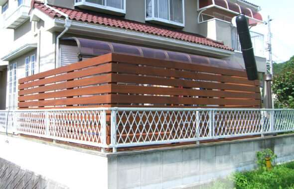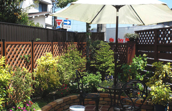 カフェを連想させるパラソルを使ったガーデンリフォーム