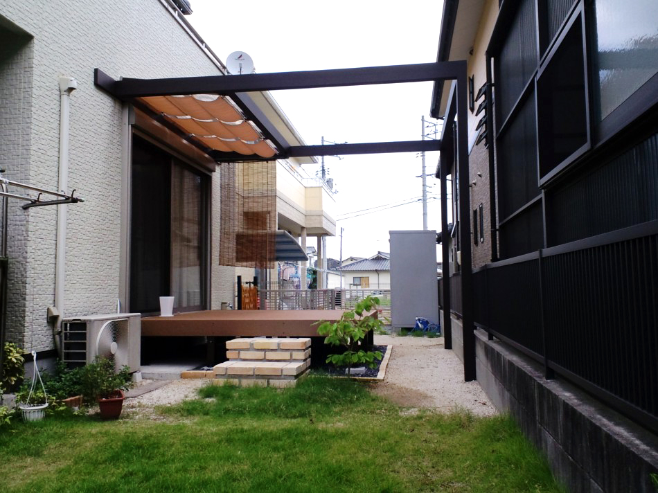 デッキ・テラス 気軽にお庭に出れるデッキテラス 洗濯を干すにもゆっくり過ごすにも丁度いいサイズのデッキテラスができました。レンガで作ったステップを使えばお子様からご年配まで気軽に上り下りできます。 デッキ・テラス 松喰い虫予防の樹幹注入剤 個人邸の庭園管理・剪定