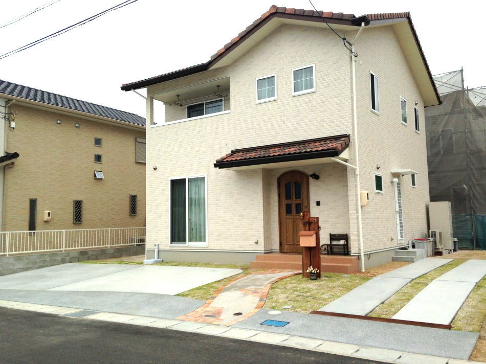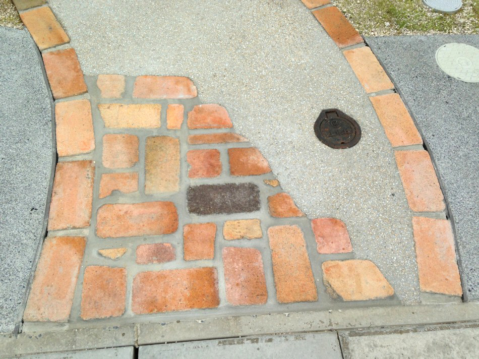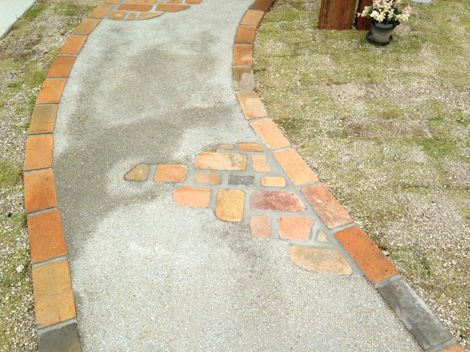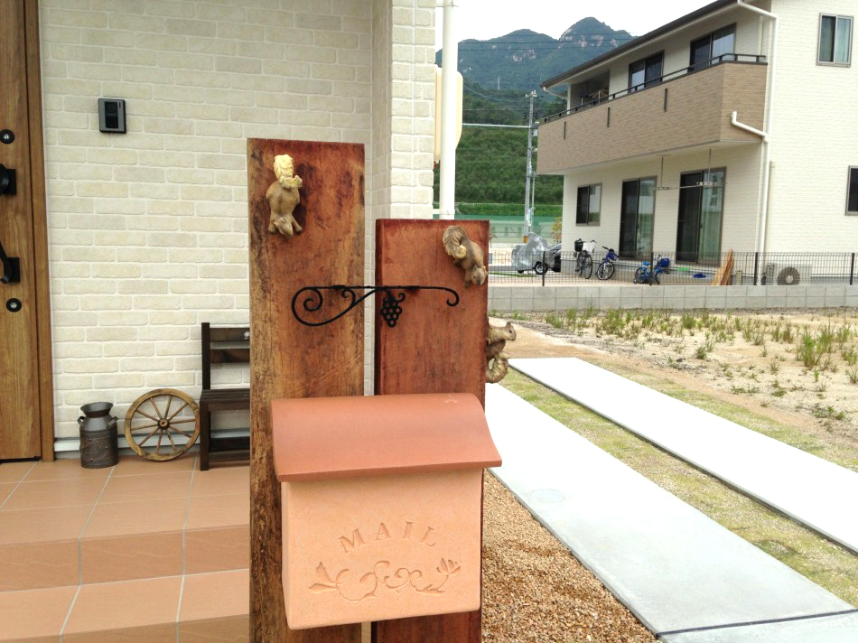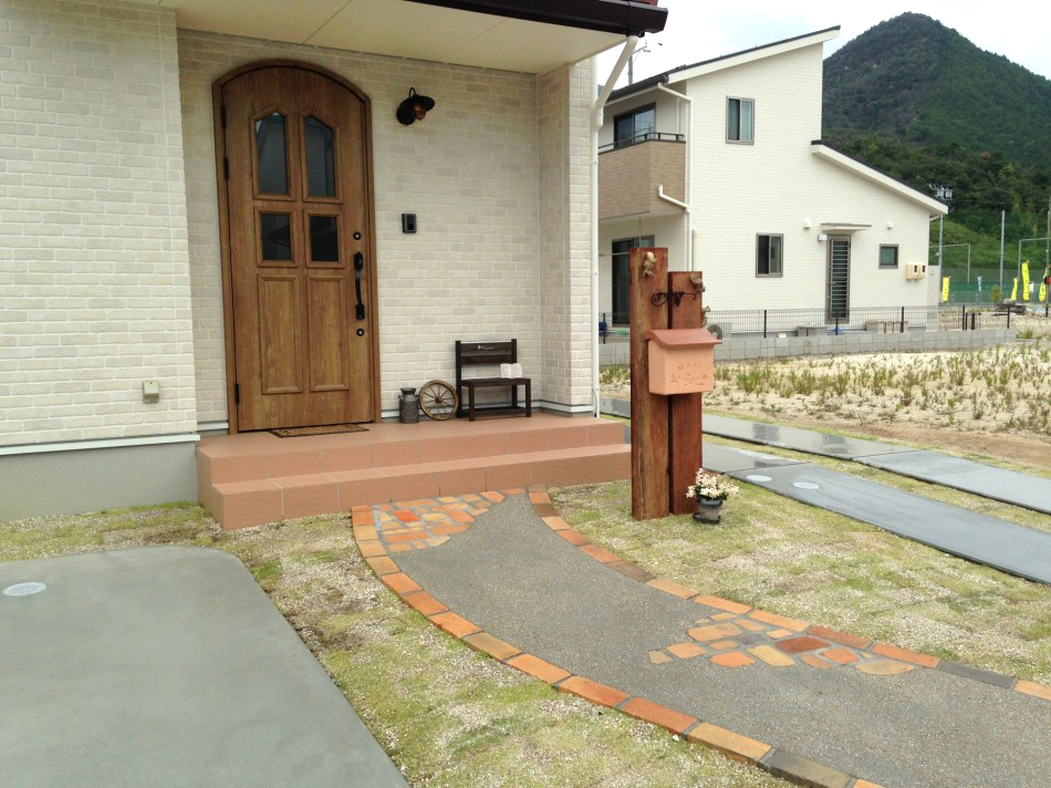 アプローチ 古レンガと枕木でナチュラルなアプローチ 施主様こだわりの古レンガの小道は、砕いたレンガを施主様と一緒に職人が一枚一枚丁寧に敷きました。枕木の門柱には、奥様からの提案でリスのオブジェがついて可愛らしくまとまった雰囲気になりました。 アプローチ, トータルデザイン, 門廻り ご夫婦こだわりのミニログハウス スギゴケとタマリュウの本格和風庭園