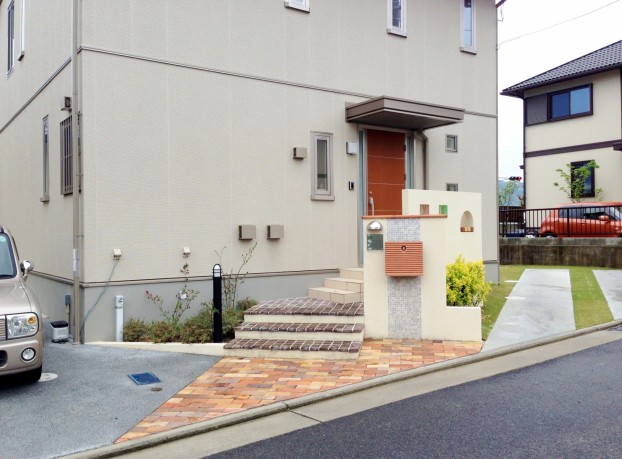 アプローチ 優しい配色のナチュラルスタイル 全体的に優しい配色で統一感のある仕上がりになりました。階段は耐火レンガ・ポルフィードのこだわりの石畳です。 アプローチ, トータルデザイン, 門廻り モダン和風の落ち着いたエクステリア